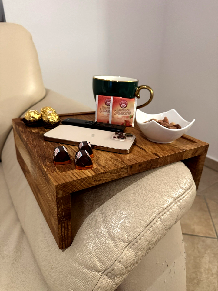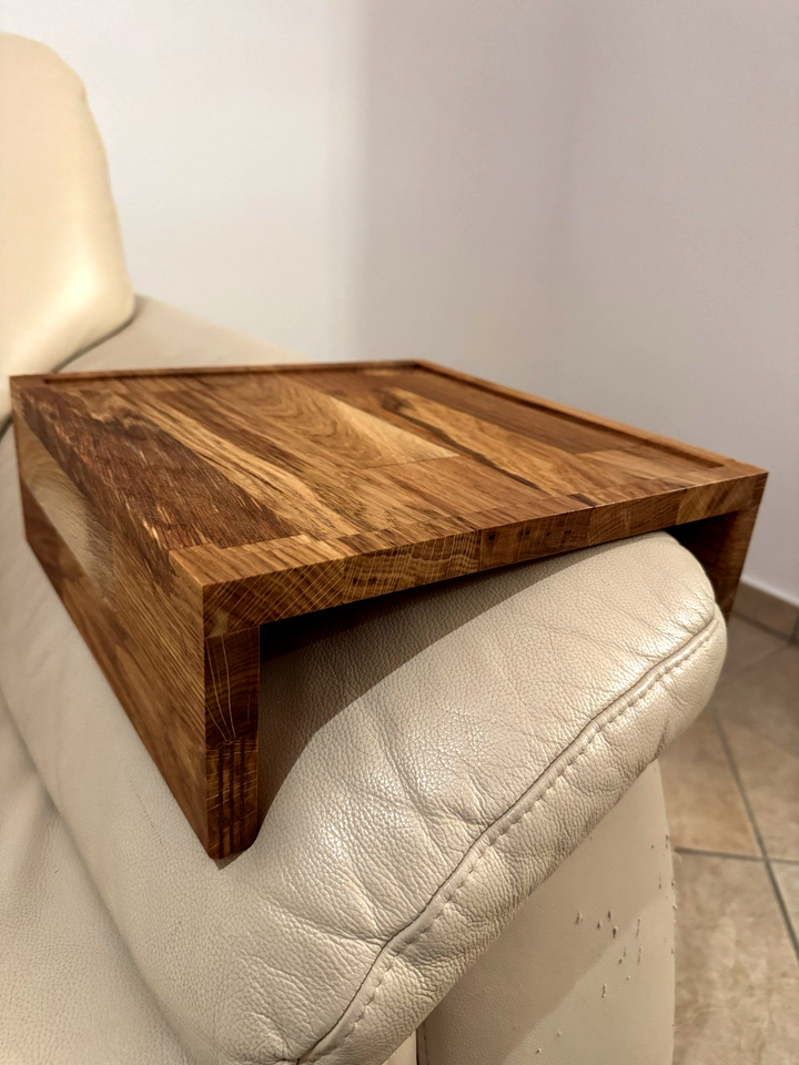 Die Couchablage wird aus massiver Eiche gefertigt.