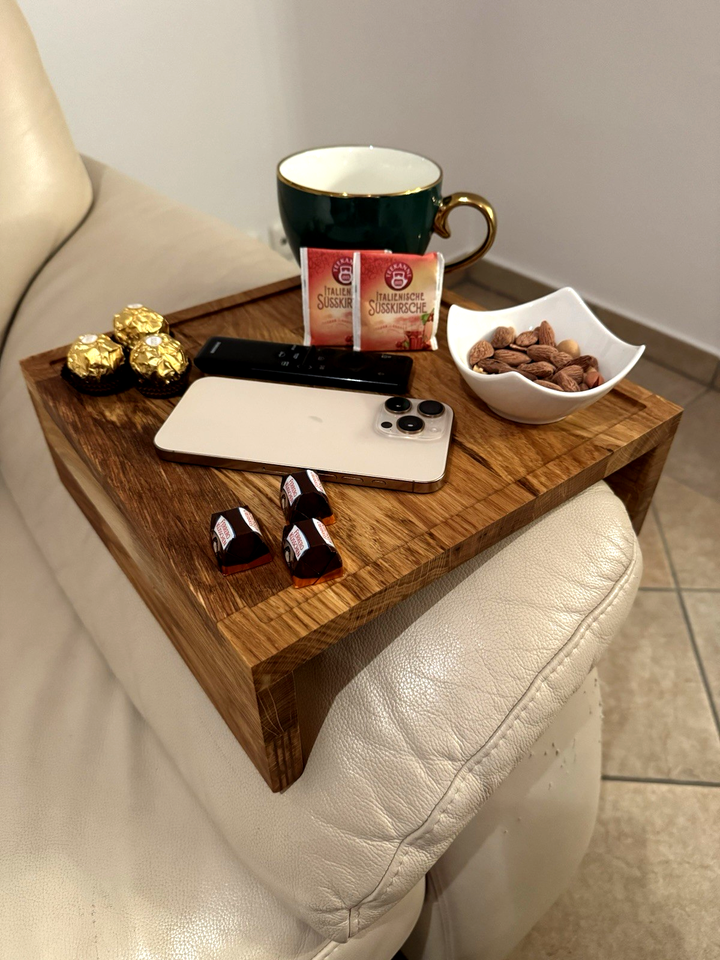 Genieße gemütliche Tage auf der Couch mit unserem exklusiven Couch-Butler, dem Must-Have für perfekte Fernsehabende. Schluss mit verschütteten Getränken und chaotischen Couchtischen – der Couch-Butler schafft Ordnung und Stil in deinem Wohnzimmer.