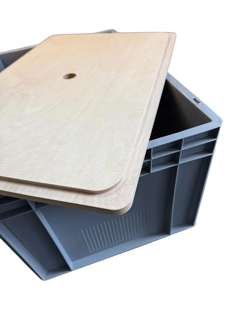 Euroboxdeckel aus 15mm witterungsbeständigen Multiplex Birkenholz. Ideal für Camping, Tisch, Trittleiter uvm. Dank der perfekt gefrästen Innenseite, kann der Deckel nicht verrutschen und passt perfekt auf die Eurobox. Der Deckel wurde in der Mitte mit einem Griffloch versehen.
