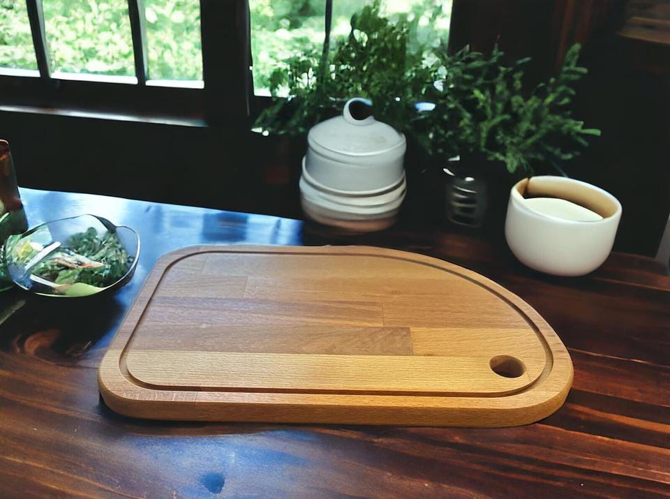 Modernes Design, abgerundete Kanten. Das Schneidebrett wurde sorgfältig mit Öl behandelt, um nicht nur die natürliche Maserung zu betonen, sondern auch die Langlebigkeit und Pflegeleichtigkeit zu gewährleisten.