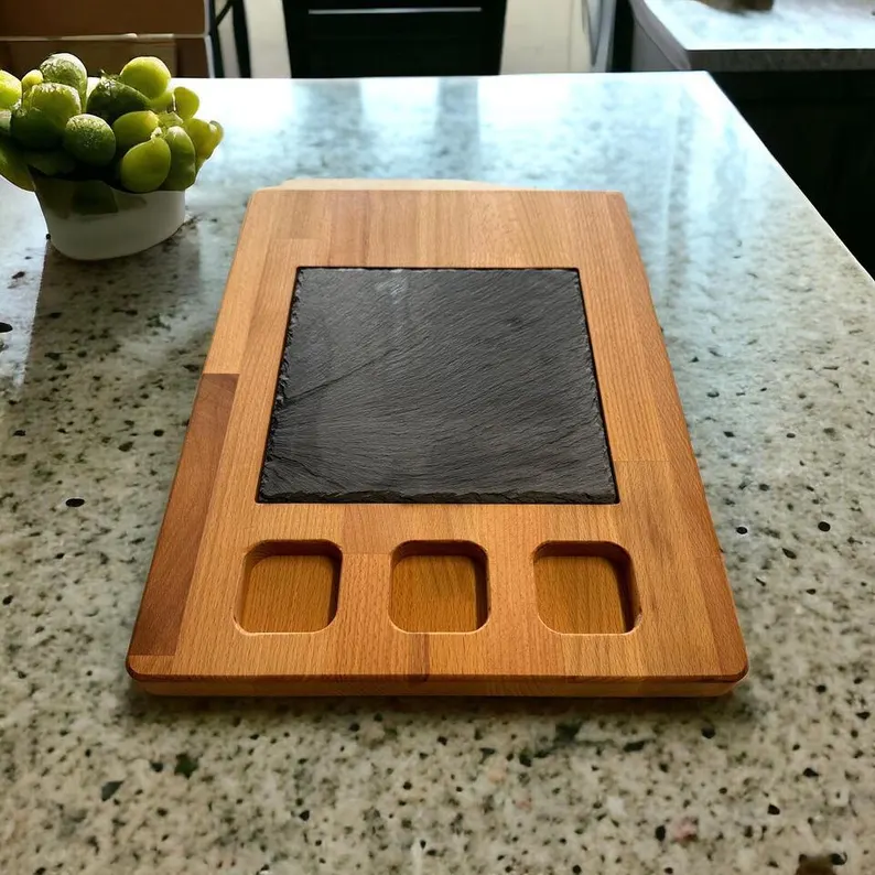 Schneidebrett Holz Buche STEAKBRETT geölt Massiv 30x40cm 27mm mit Schieferplatte und 3 Taschen für Soßen oder Beilagen