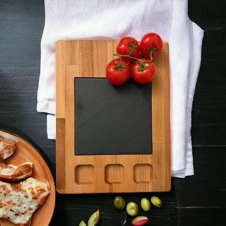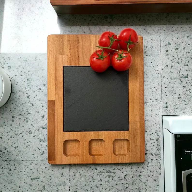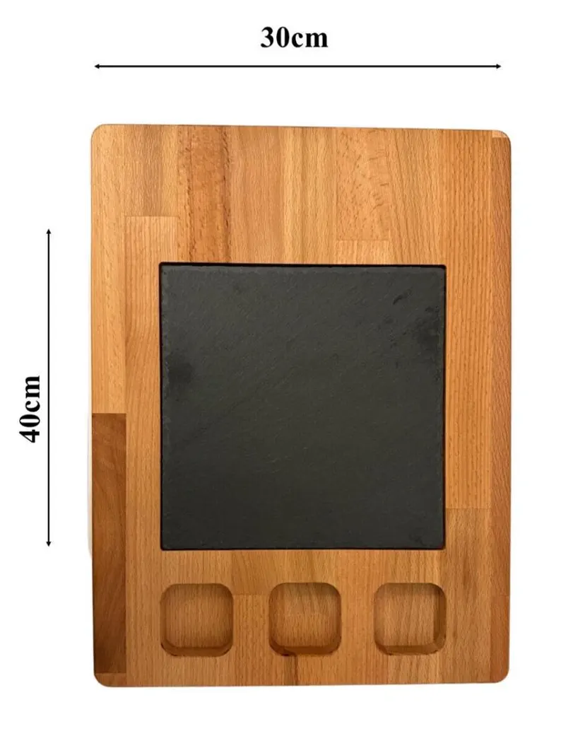 Hochwertiges Buchenholzbrett, mit den Maßen 30x40x2,7 cm. Dieses Brett ist äußerst vielseitig einsetzbar und eignet sich perfekt als Küchenbrett, Schneidebrett, Frühstücksbrett, Steakbrett oder Servierbrett. Das Brett ist mit einer Schieferplatte versehen.